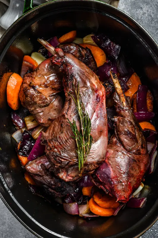 Place the roasting pan in the oven at 160°C top and bottom heat and braise the rabbit legs for about 1.5 to 2 hours, until the meat is nice and tender. Turn the legs once during cooking.