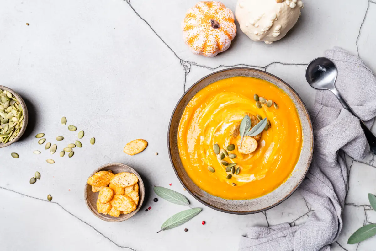 In Schalen servieren und mit Kürbiskernen, Croutons, Kräutern und einem Klecks Joghurt oder Kokosmilch garnieren.