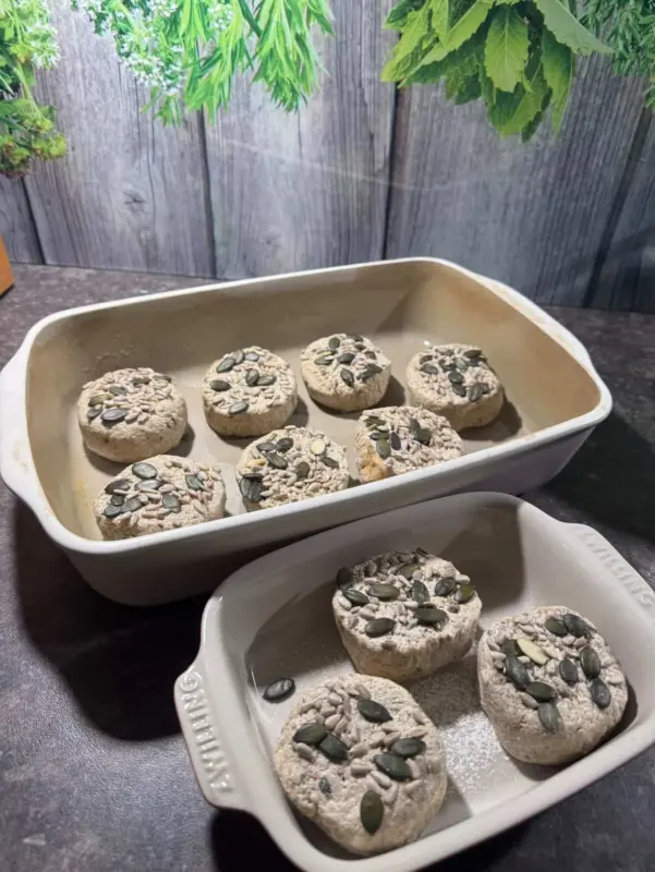 Mehle, „Zitrus Bitch“ und Kerne mischen. Hefewasser, Frischkäse und Öl zugeben → alles zu einem weichen, leicht klebrigen Teig verkneten.