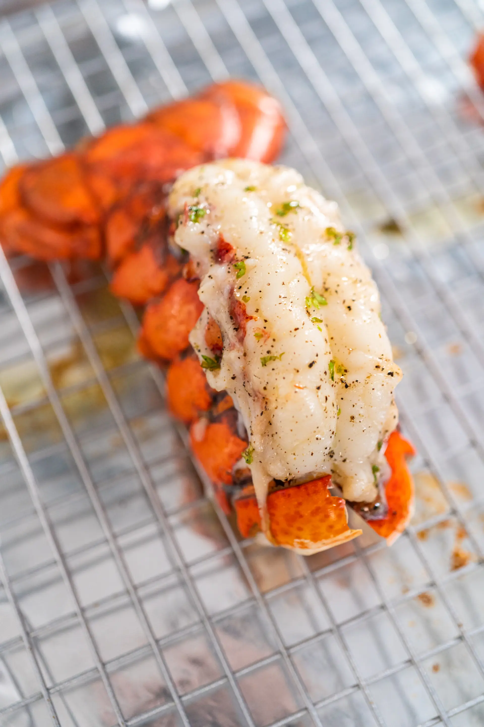 Gegen Ende der Grillzeit die Hummerschwänze kurz direkt unter die Hitzequelle geben, damit das Topping leicht karamellisiert.