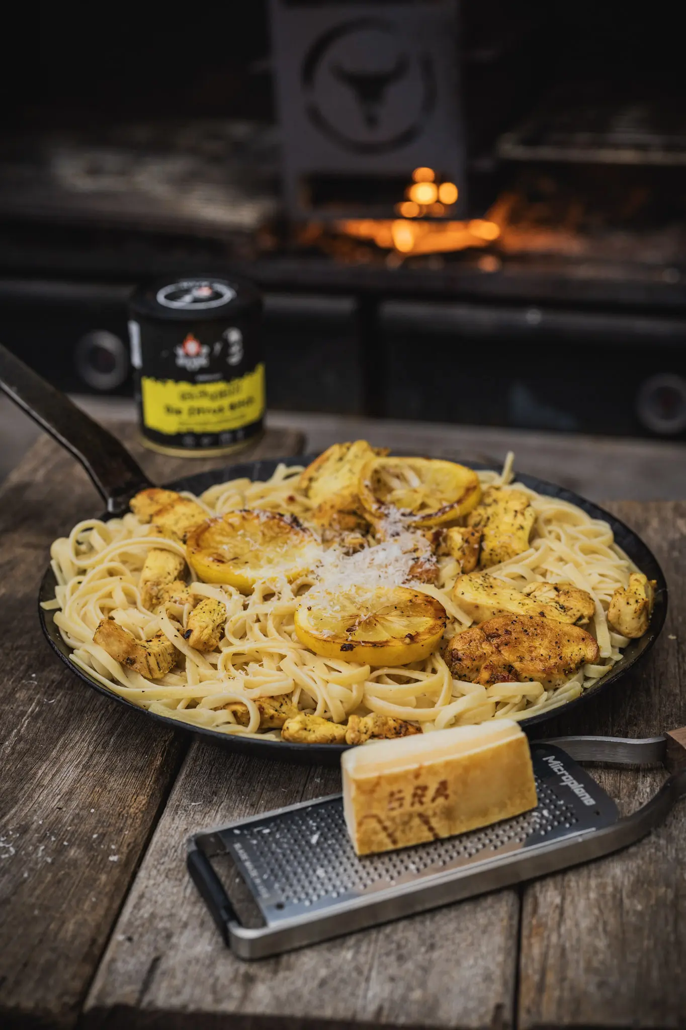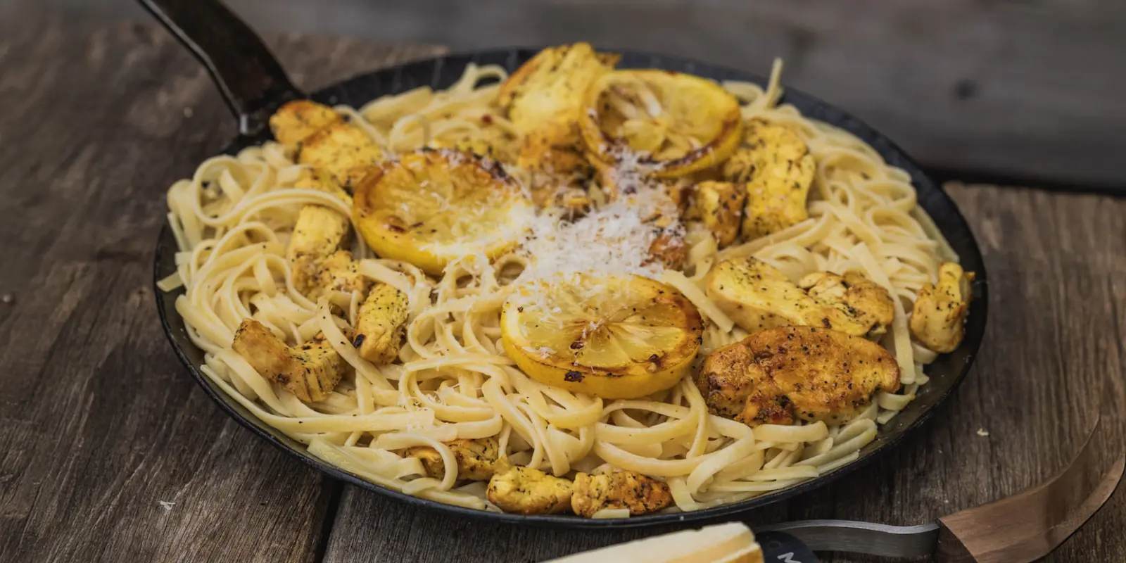Hähnchenstreifen unterheben oder obenauf legen. Mit extra Zitronenzesten und Parmesan servieren.