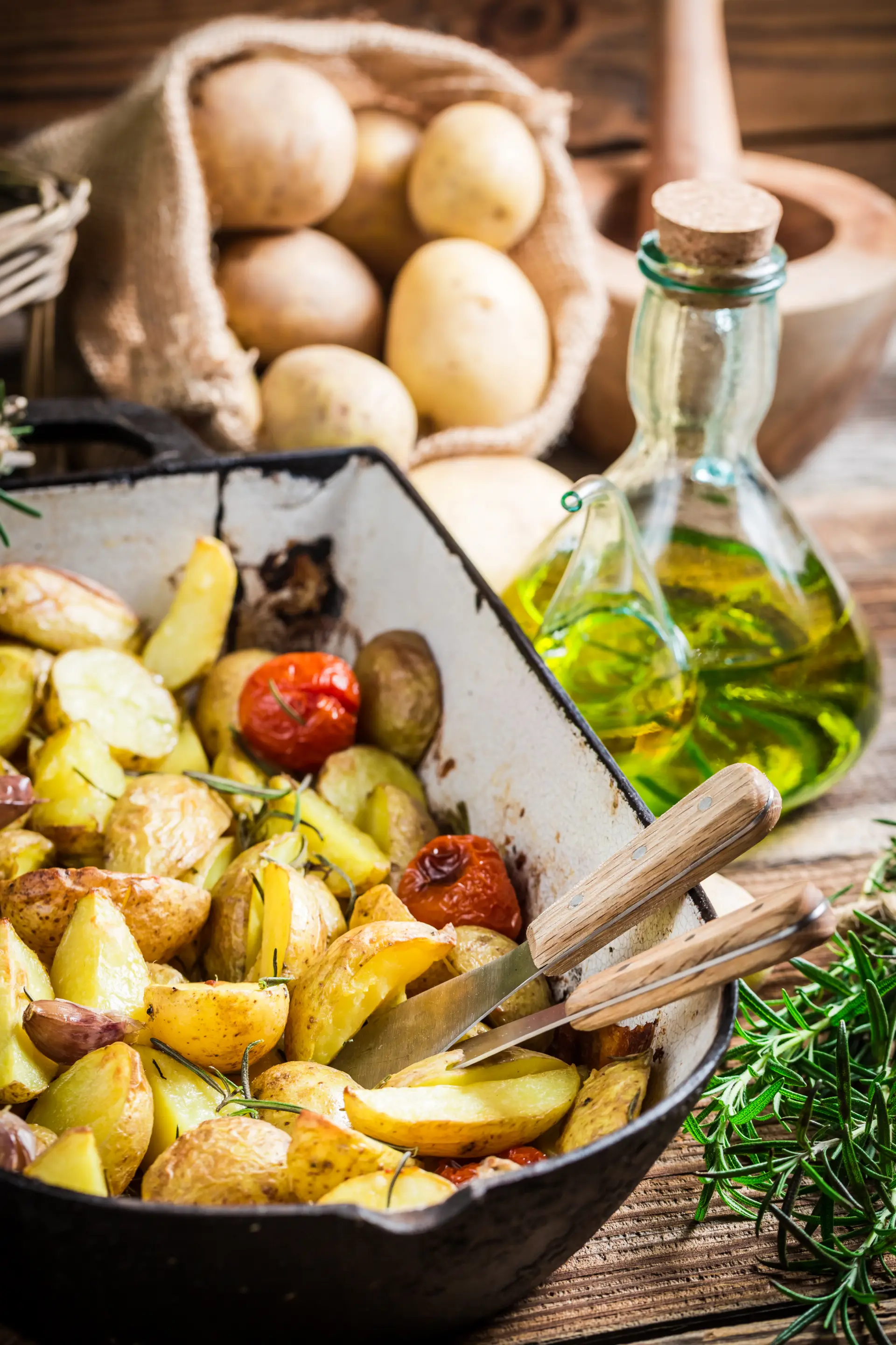 Kartoffeln gründlich waschen (nicht schälen), in Spalten oder Würfel schneiden.