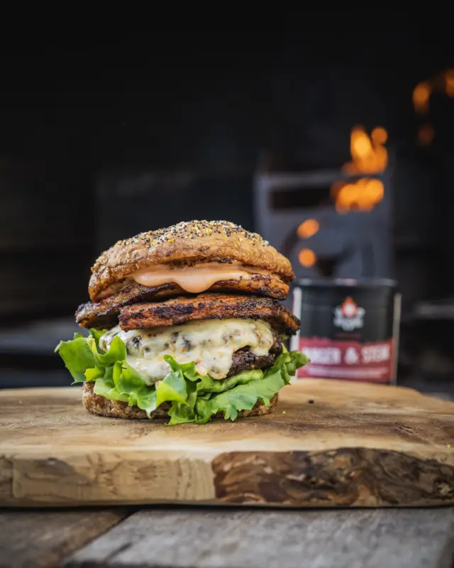 Das Hackfleisch mit „Burger & Steak“ vermengen und dann locker in 4 Patties à ca. 150 g formen (nicht zu fest drücken). Die Patties im ausgelassenen Baconfett bei mittlerer bis hoher Hitze 3–4 Minuten pro Seite braten. 1 Minute vor Ende der Garzeit je 1–2 Scheiben Kimchi-Käse auflegen, Pfanne abdecken und schmelzen lassen.