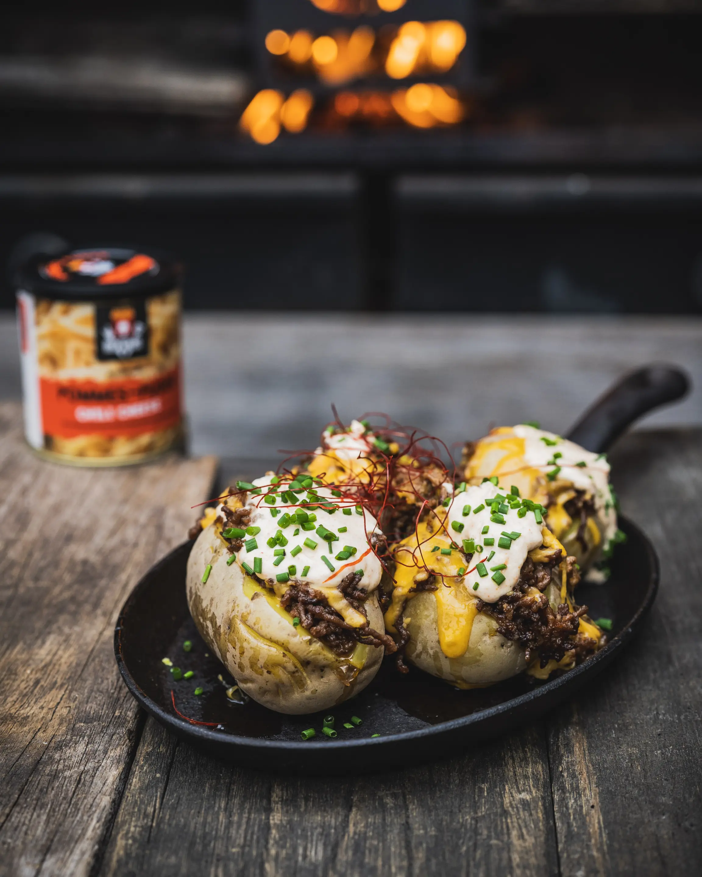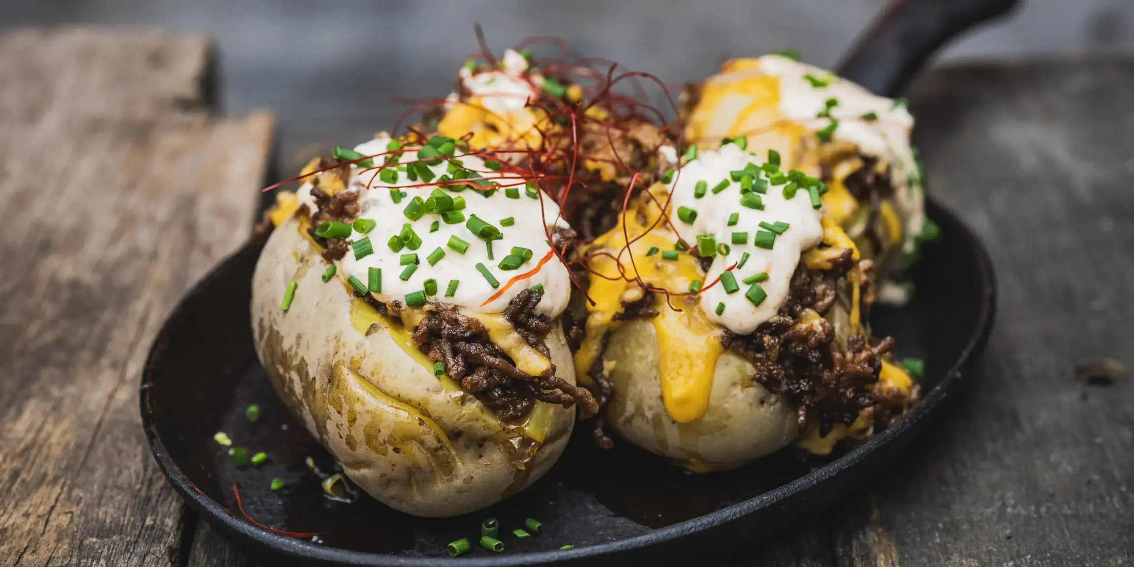 Schneide die garen Kartoffeln der Länge nach ein und drücke sie leicht auseinander. Fülle das Hackfleisch hinein, bestreue alles großzügig mit Cheddar und lass den Käse im heißen Ofen oder Grill kurz schmelzen.
